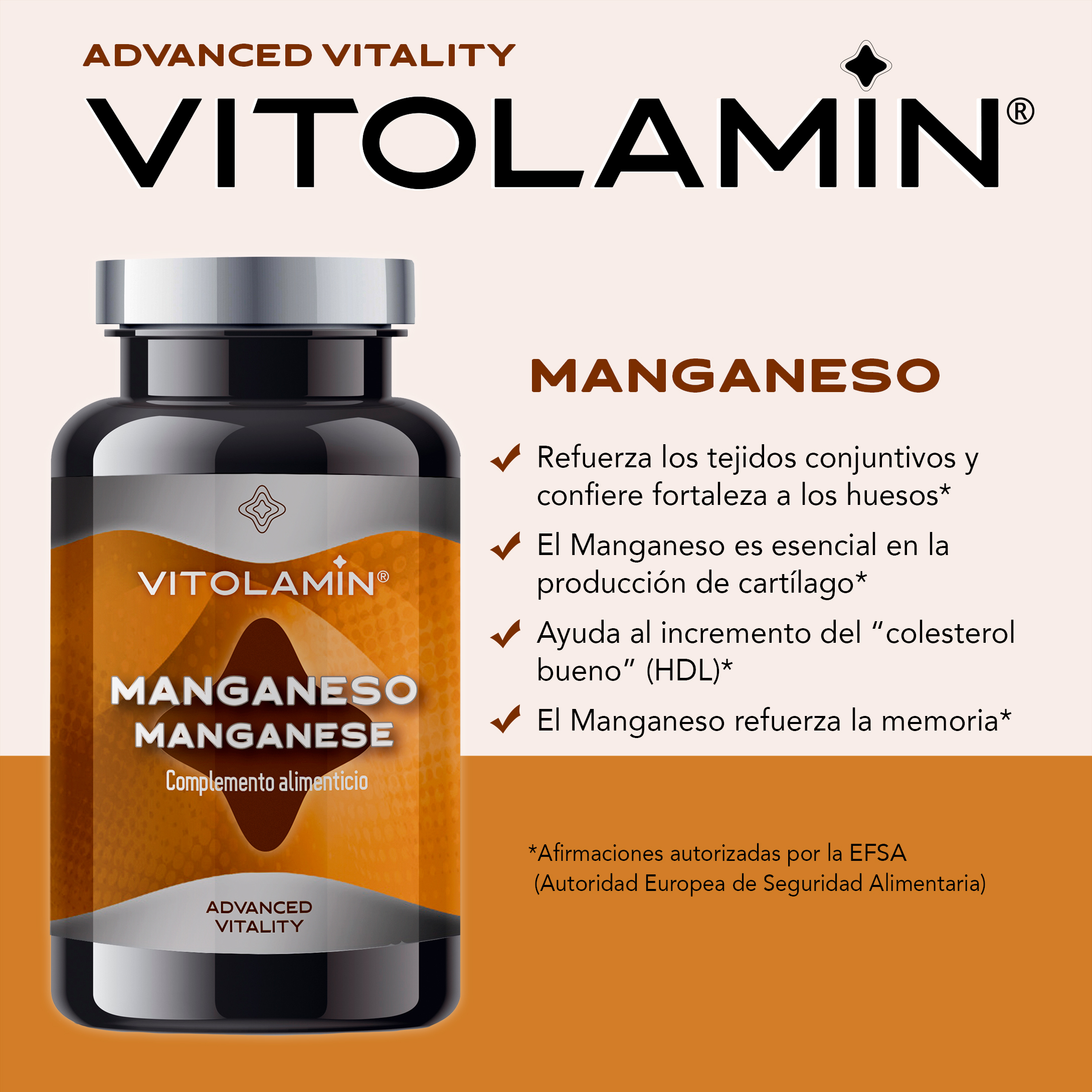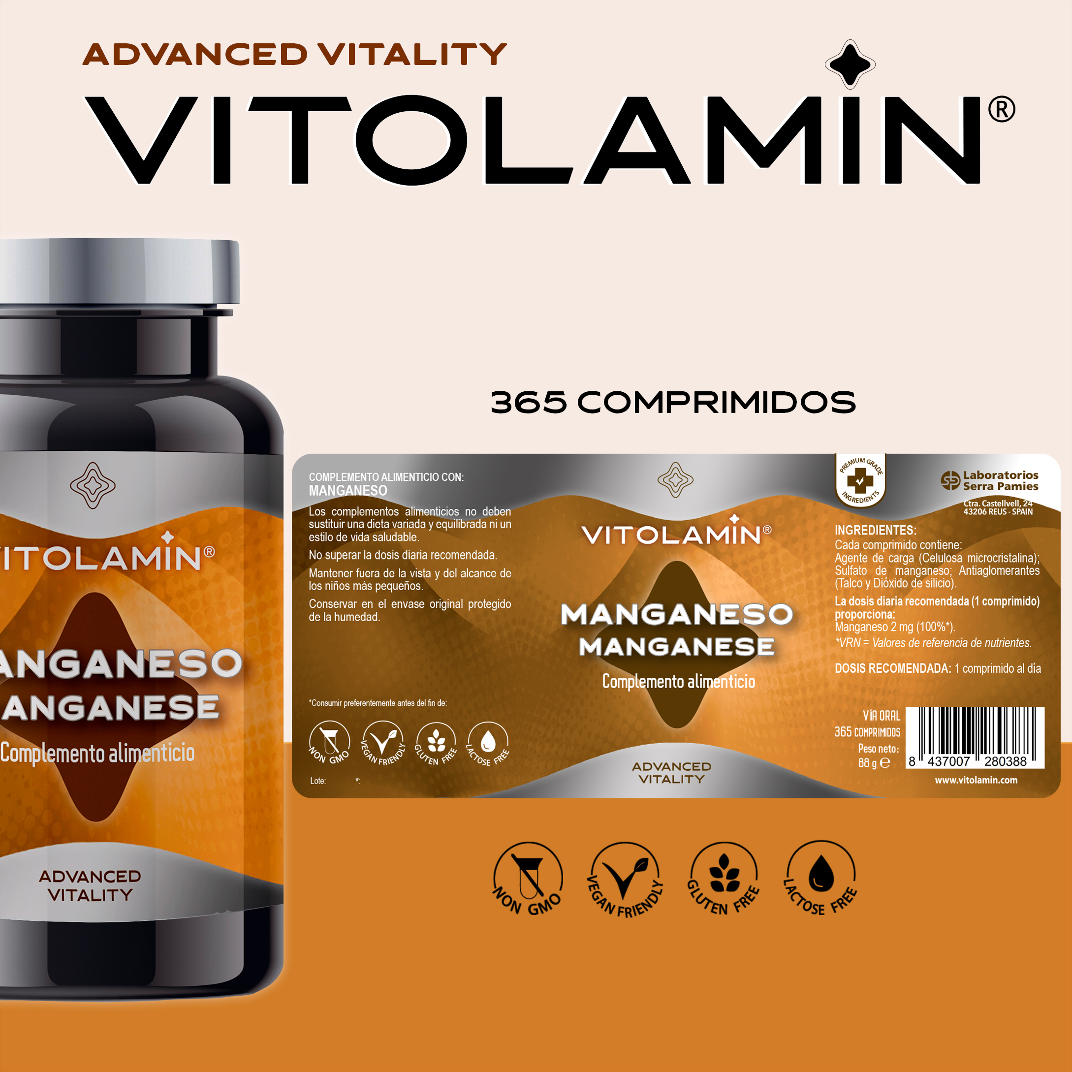 VITOLAMIN® MANGANESO 365 comprimidos vegetarianos de sulfato de manganeso puro | El manganeso refuerza los tejidos conjuntivos y confiere fortaleza a los huesos y cartílagos.